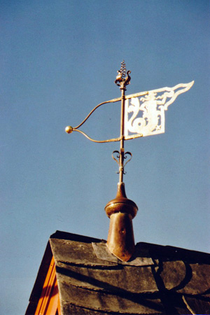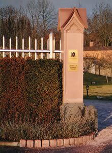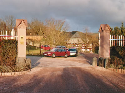 ![]() Tor aus Edelstahl, Pfeiler aus Sandstein und Basaltlava, Weingut Weil. Höhe 3,78m. Bewußte Symbiose zwischen Tradition und Moderne. |